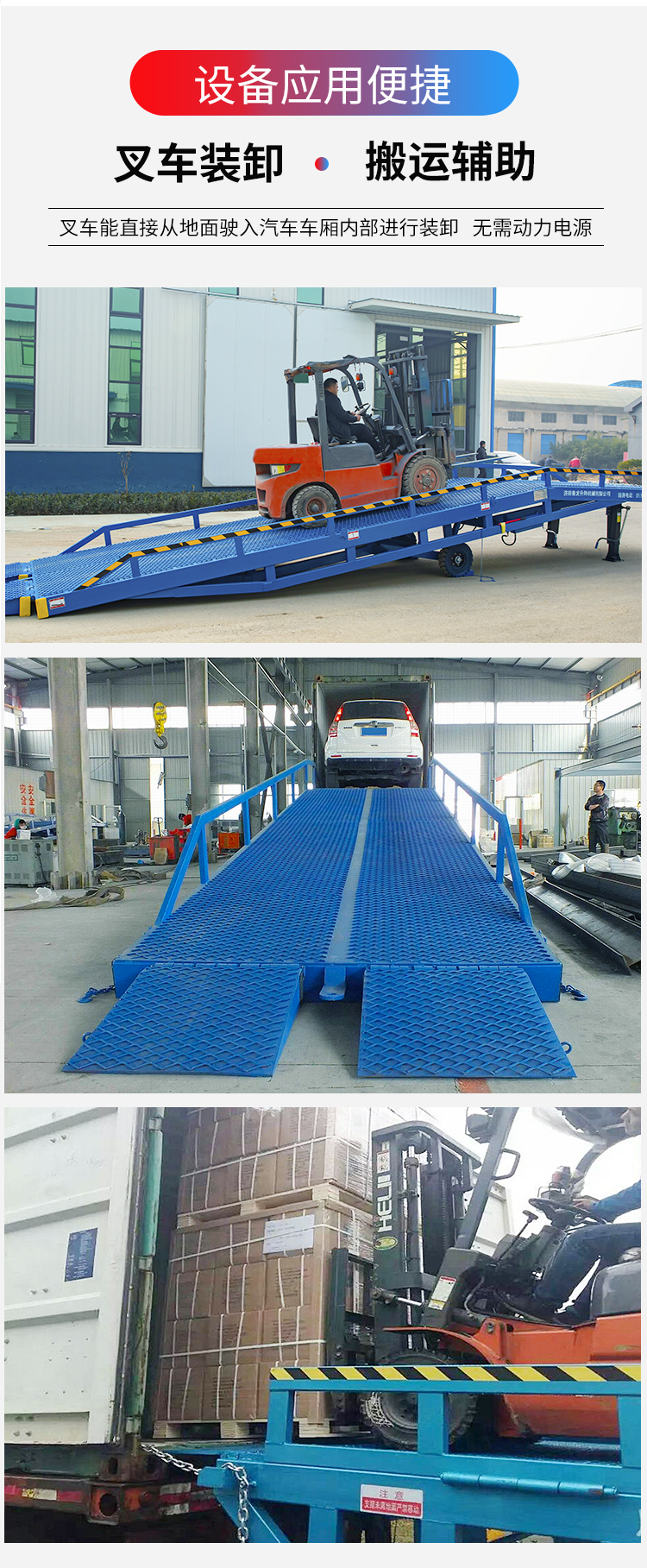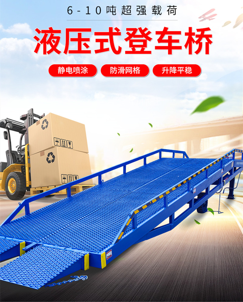 产品优势:移动式液压登车桥单人操作,移动灵活方便,提高工作效率,节省劳动力,代替固定月台不可移动的弊病。