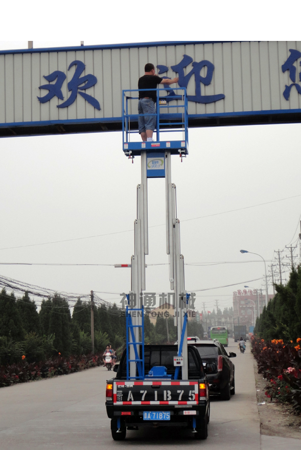 产品规格:车载铝合金式升降平台根据升降高度可分为:单柱6、8、10米,双柱6、8、10、12米升降平台,设备载重150公斤至200公斤。客户可根据需求选用解放、东风、轻骑、福田、电瓶车等任何车型,设备直接采用汽车或电瓶的直接动力升降。