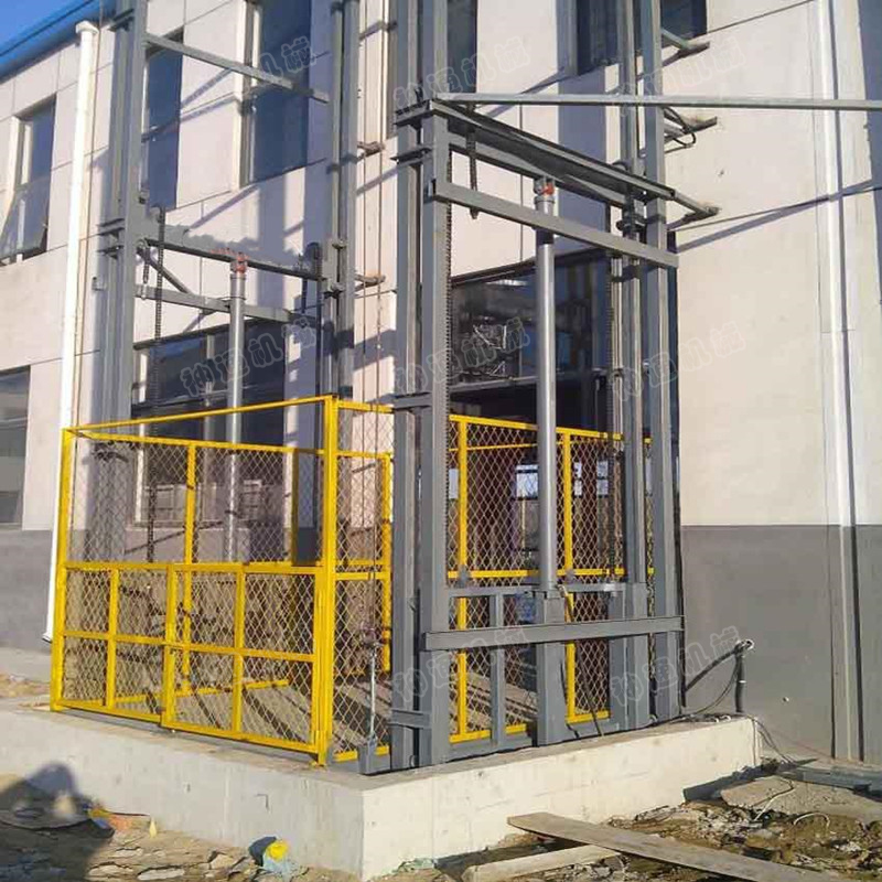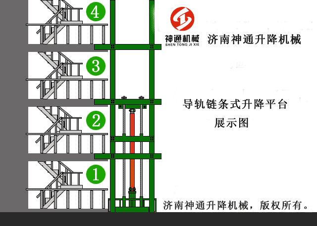导轨链条式液压升降平台是一种非剪叉式升降货梯,用于二层以上工业厂房、餐厅、酒楼货物运输,由于最低高度仅150-300mm,最实用于不能开挖地坑的工作场所,同时无须上部调点,具有多种形式(单跨、双跨),动作平稳、操作简单可靠,液压、电器多种货物传输经济、轻松。(具体承载力及升高层数、尺寸可根据用户要求设计制作)!